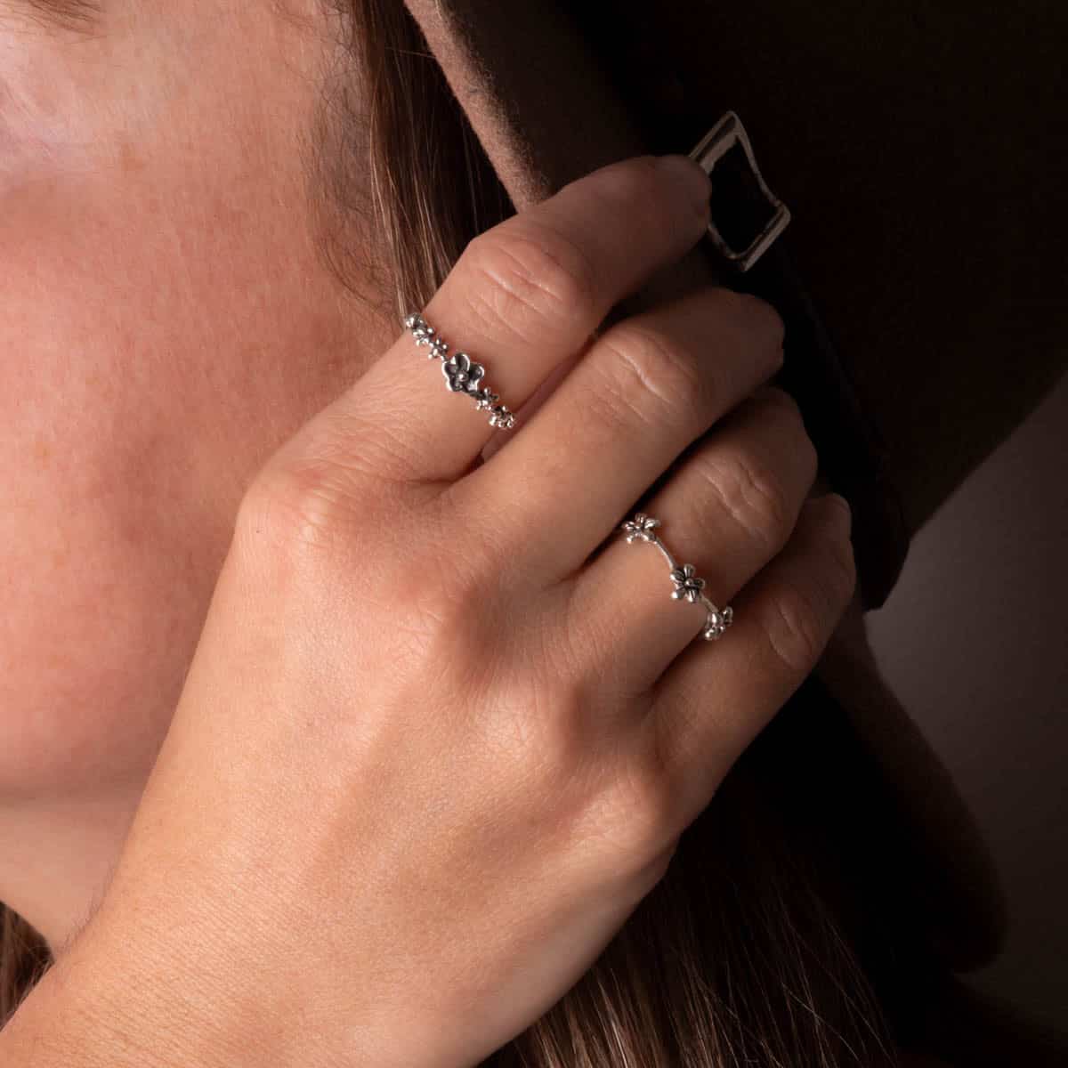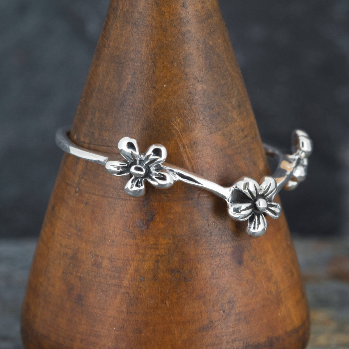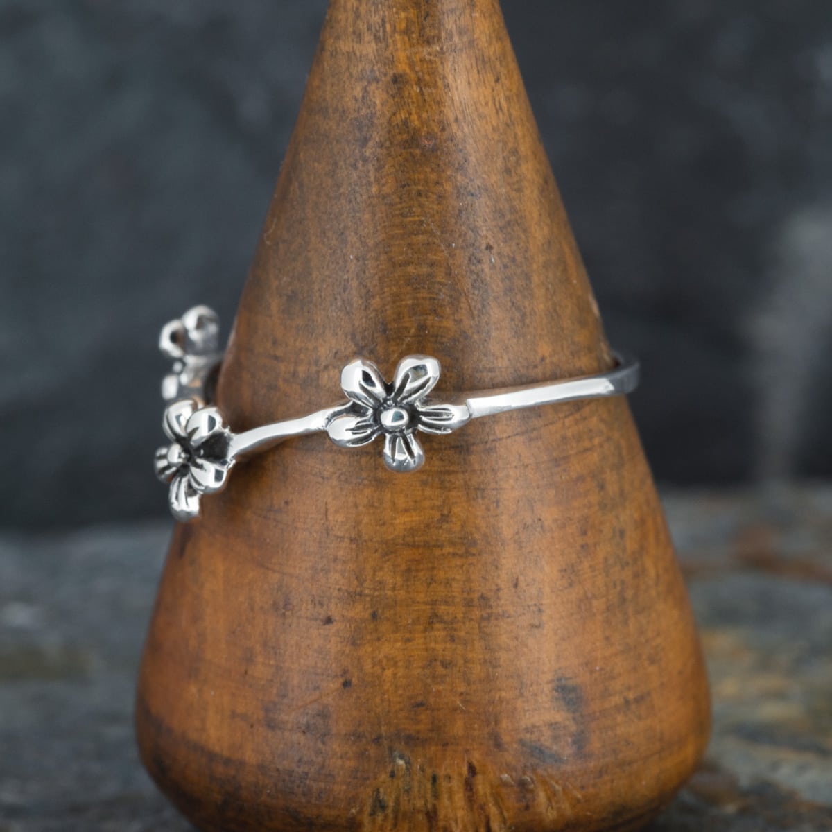 This delicate 925 Sterling silver ring features a pretty Scottish wildflower garland, based on the forget-me-not, with a unique wishbone shape. The Sterling silver is oxidised to highlight the intricate details. Great for stacking rings and perfect for everyday wear. This dainty ring would make a thoughtful bridesmaid or flower girl gift.