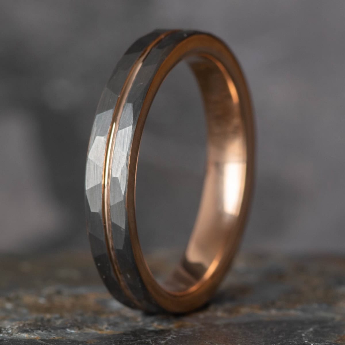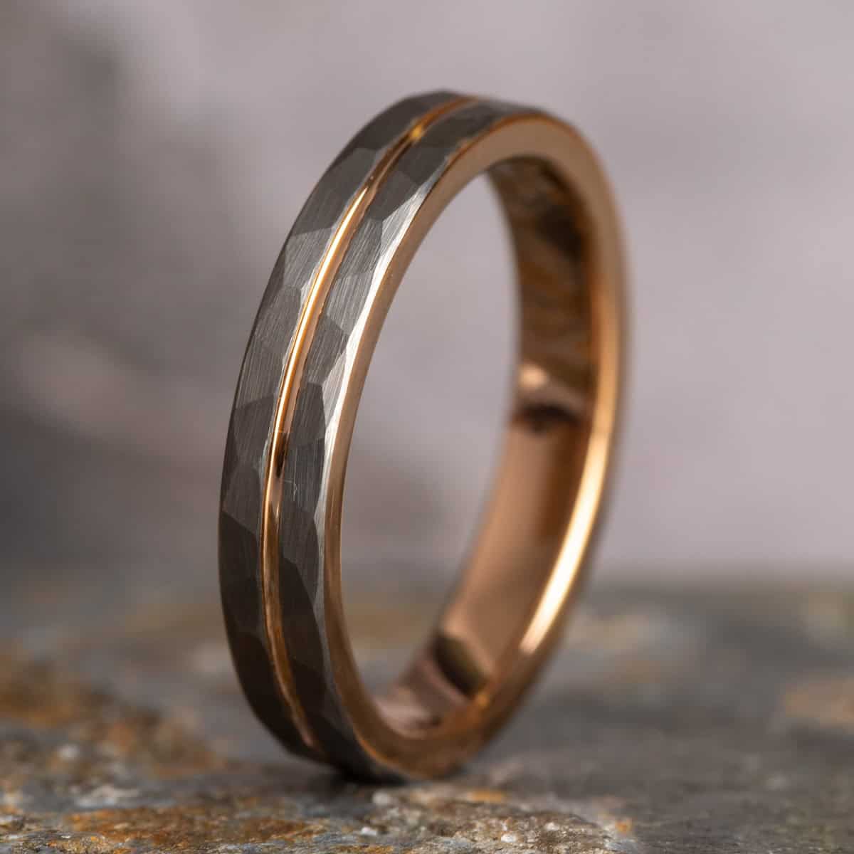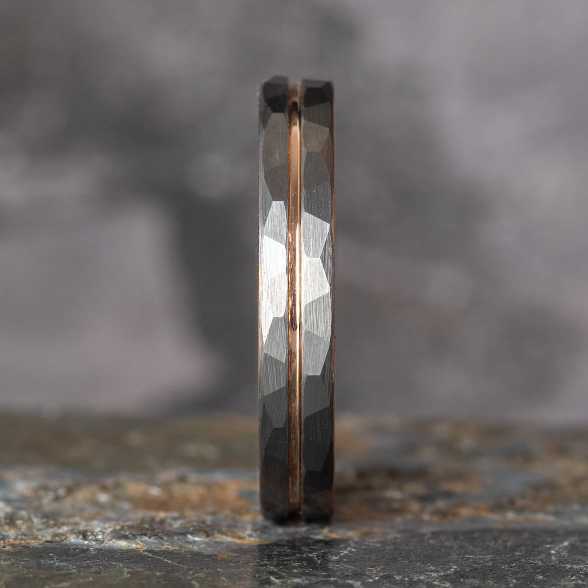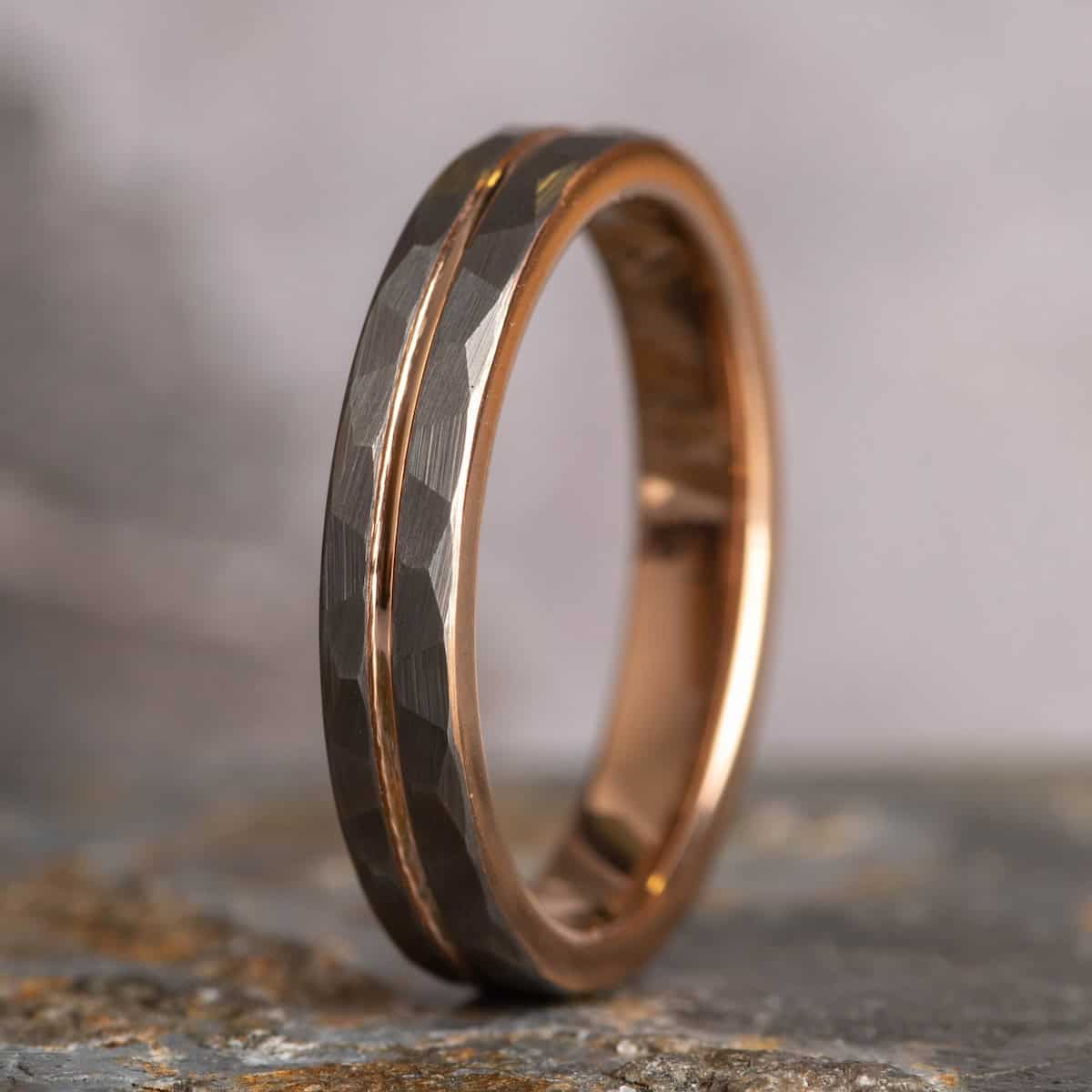 Hammered Silver Tungsten Ring with Rose Gold Accent (4mm wide)