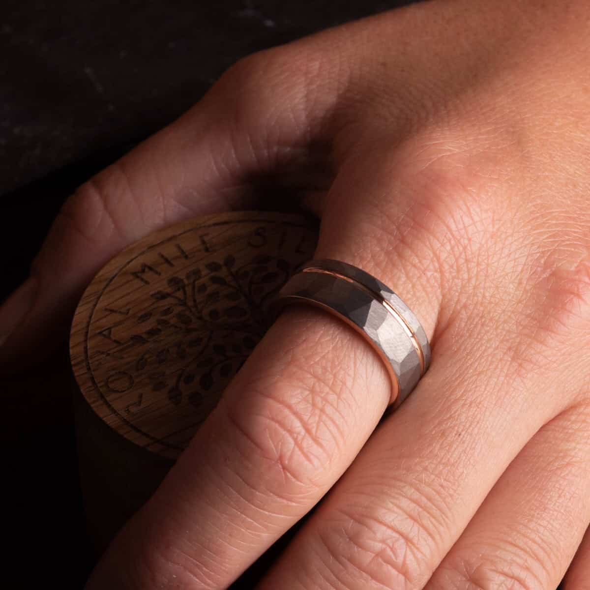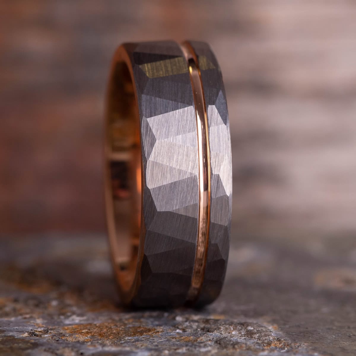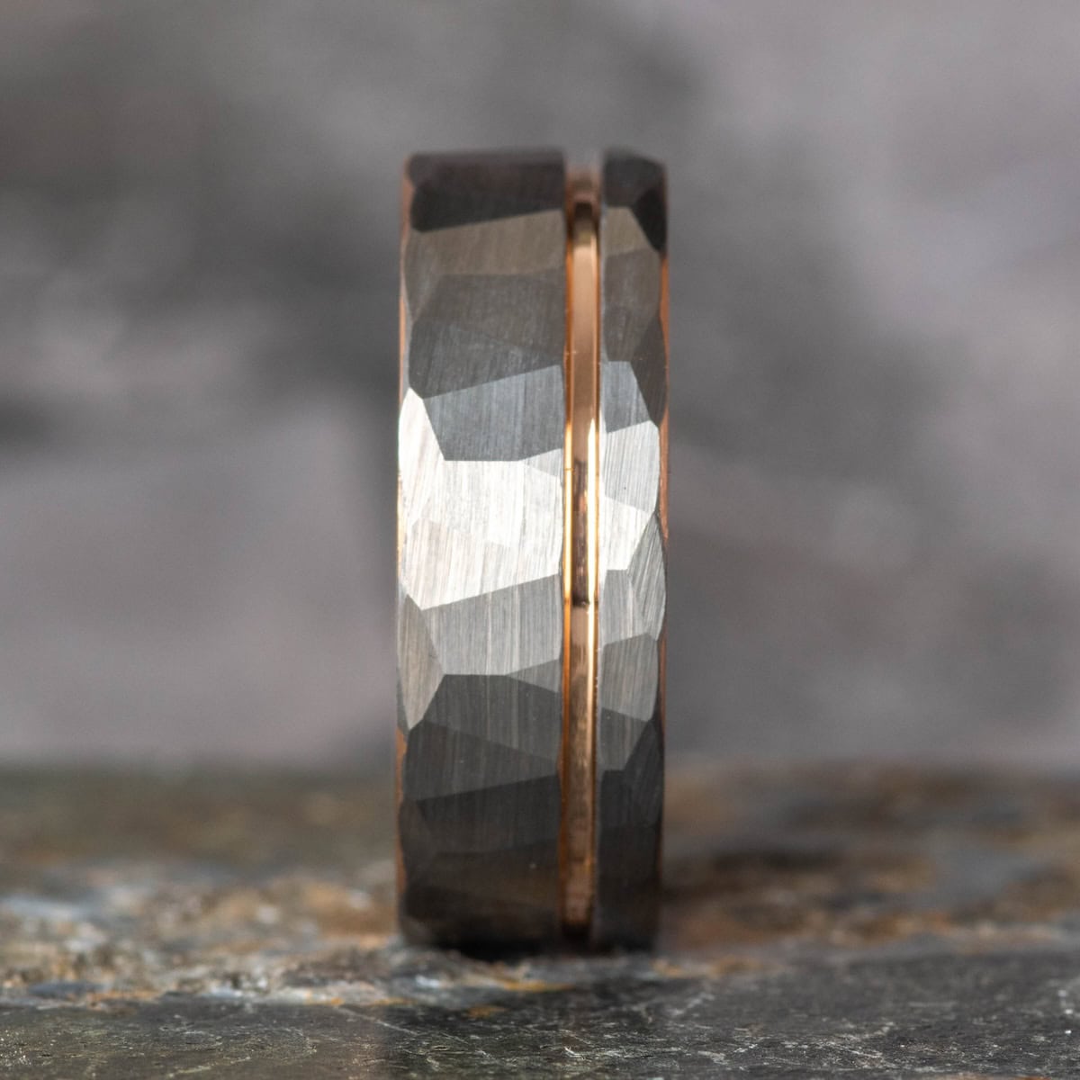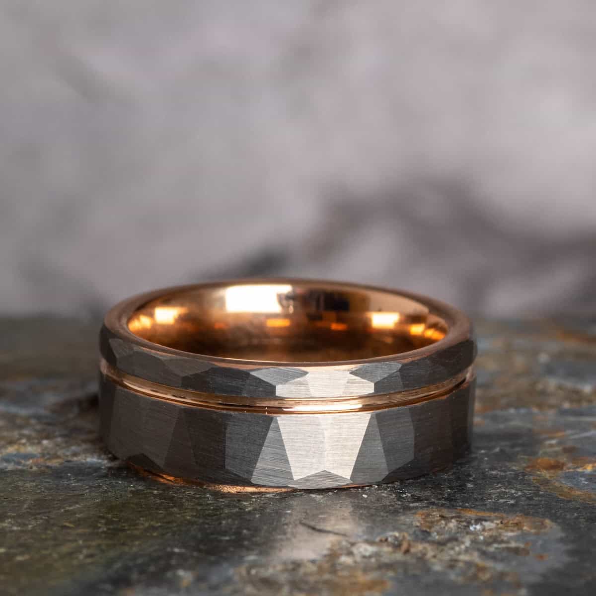 Hammered tungsten ring with rose gold inlay and rose gold interior. The texture of the hammered silver band catches the light and makes the spectacular rose gold accent stand out.