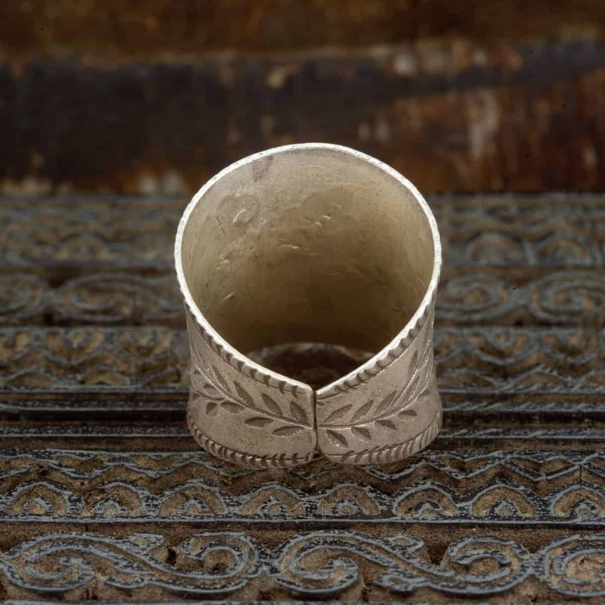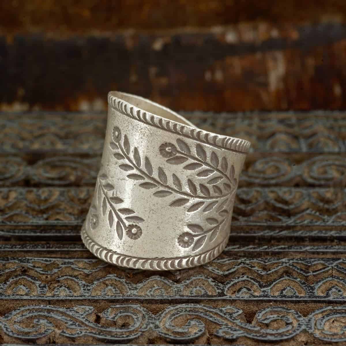 Inspired by tribal art this beautiful and unique handmade ring is very comfortable to wear. As this silver is softer it allows for nature-inspired stamping and marking of the metal, which is oxidised to highlight the design. The softness of the metal means this piece moulds to the unique shape of your finger over time, although rest assured that this is a solid, chunky ring and even though the silver is softer it is a hard-wearing ring that will last.