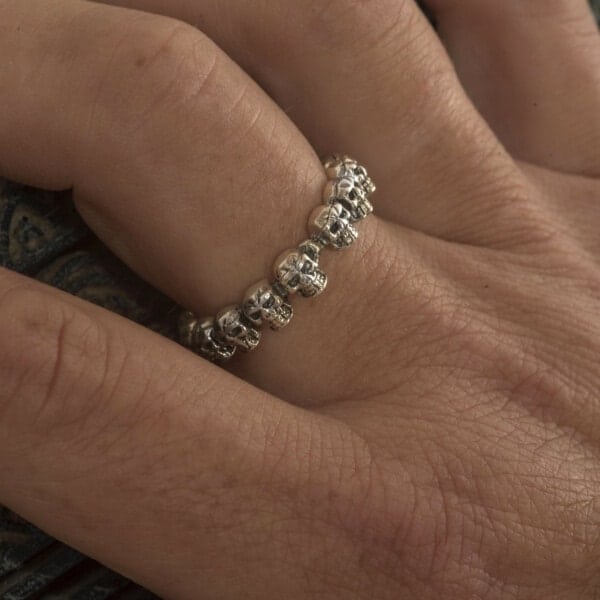 Little silver skulls all the way around this silver band create a unique ring. Personal favourite of our model, Mel.
