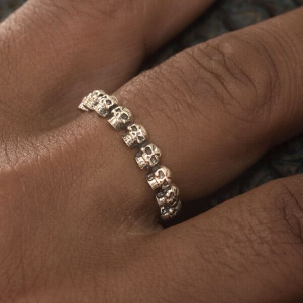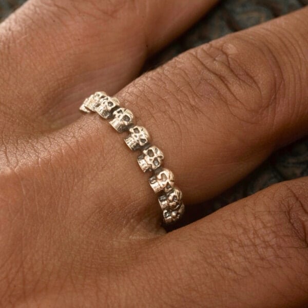 Little silver skulls all the way around this handmade silver band create a unique ring. Personal favourite of our model, Mel.