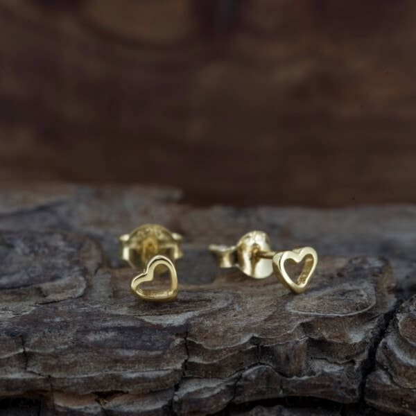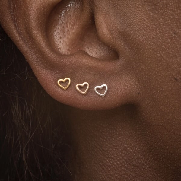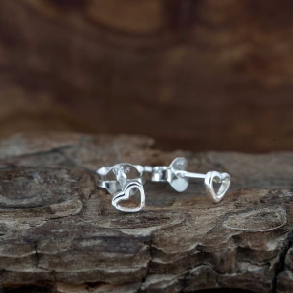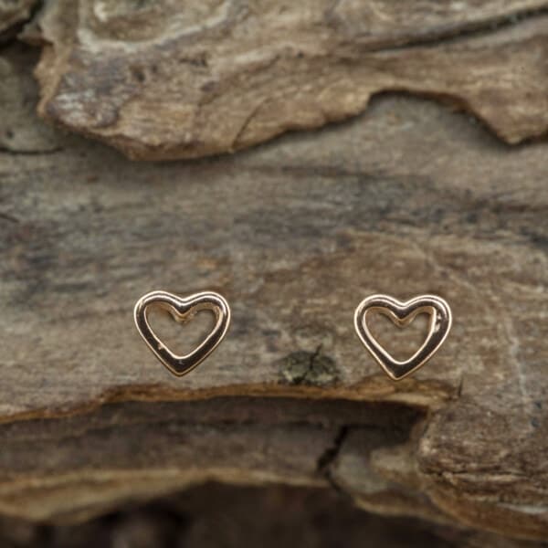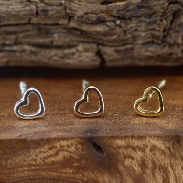 Tiny open heart studs cast in Sterling Silver available in 3 hypoallergenic finishes: